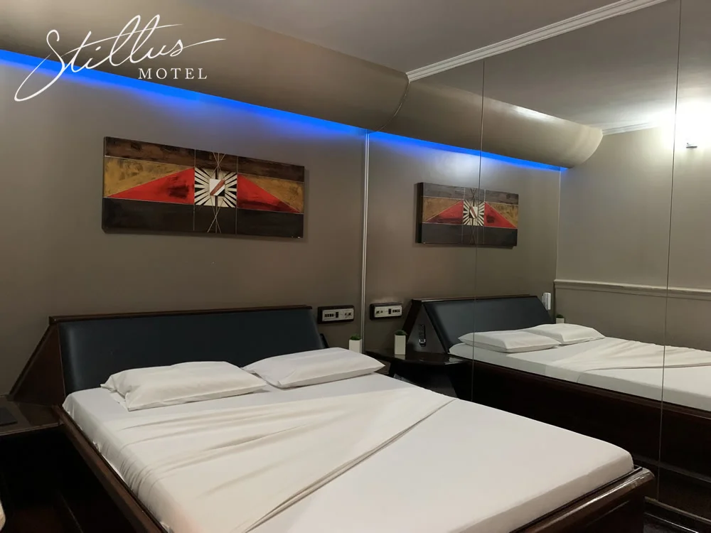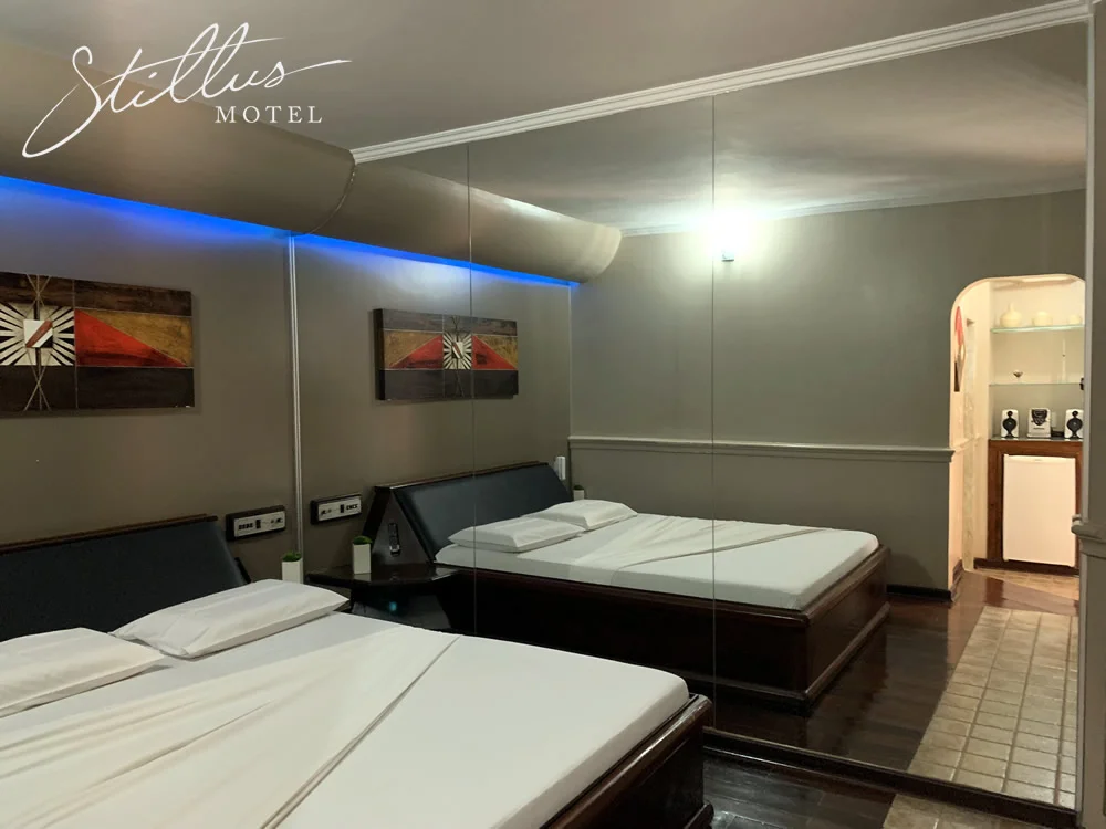 Cama queen size / Banheira com hidro / Ar condicionado – quente e frio / Decoração personalizada / luzes de neon / Frigobar / Banheiro com ducha / TV – convencional e privativa / Som privativo
